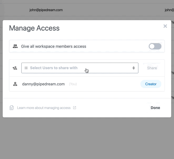 Access to connected accounts is enforced at the step-level within workflows and is designed with security and control in mind. When you connect an account in Pipedream, you are the owner of that connected account, and you always have full access. You can:- Manage access
