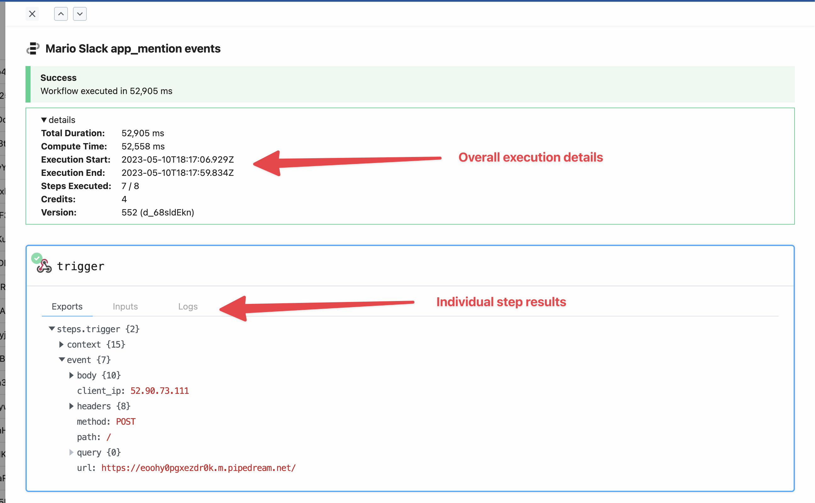 - Clicking on an individual event will open a panel that displays the steps executed, their individual configurations, as well as the overall performance and results of the entire workflow.