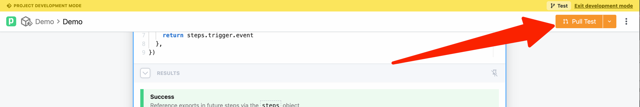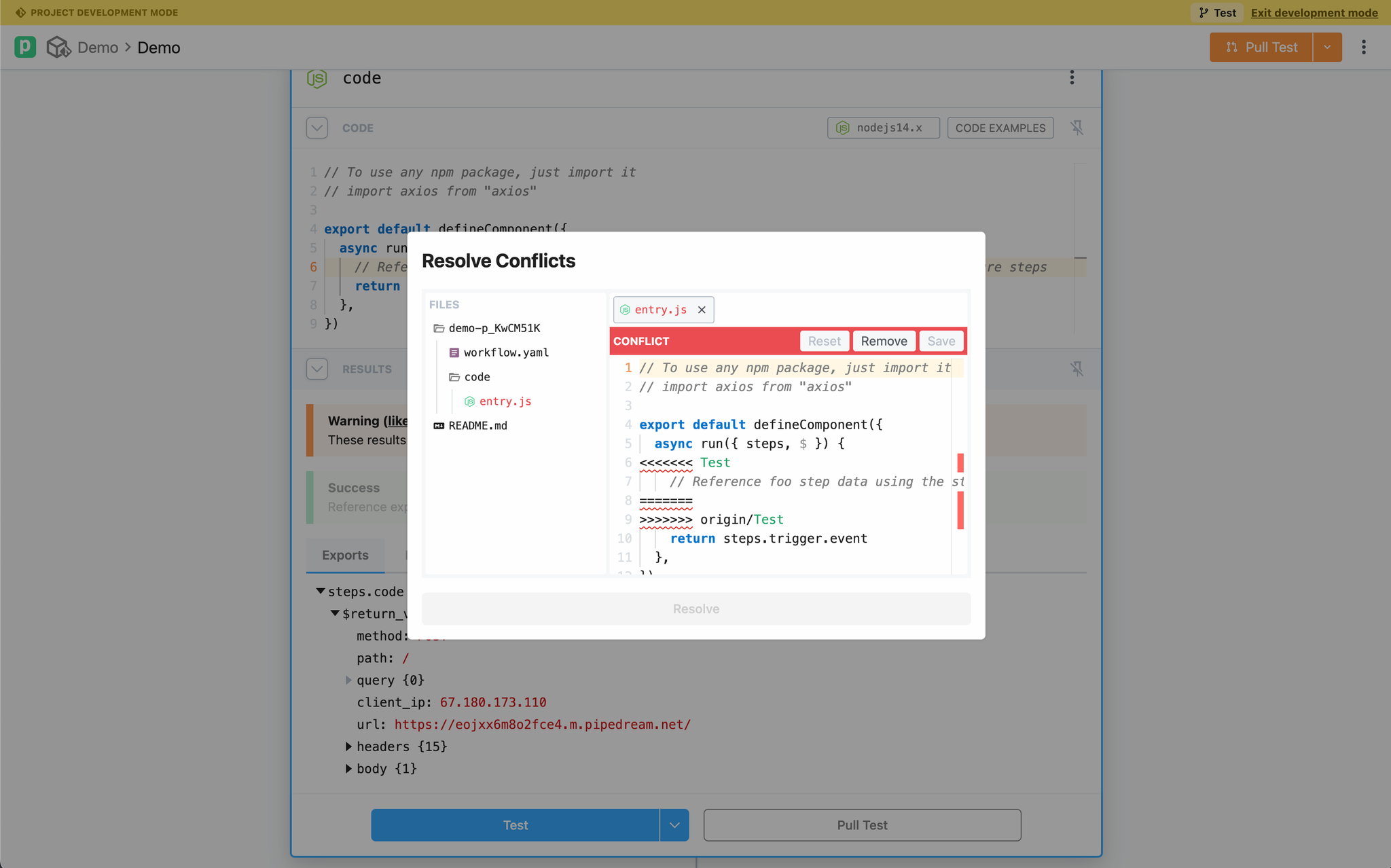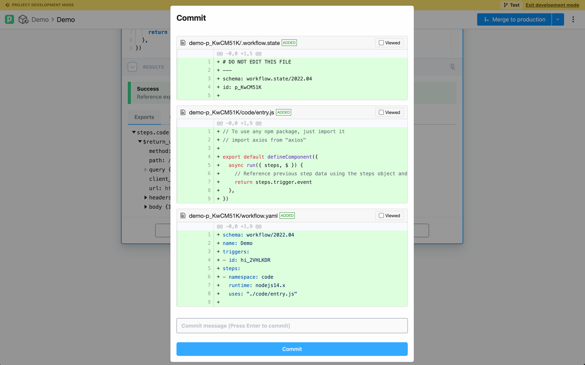 - Open the project in Pipedream’s UI and load your development branch