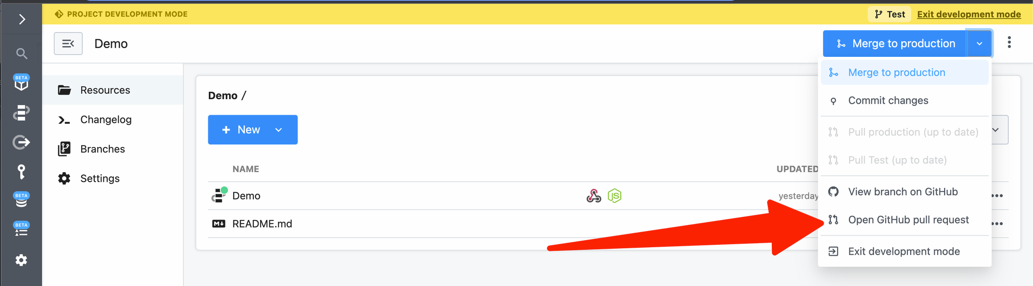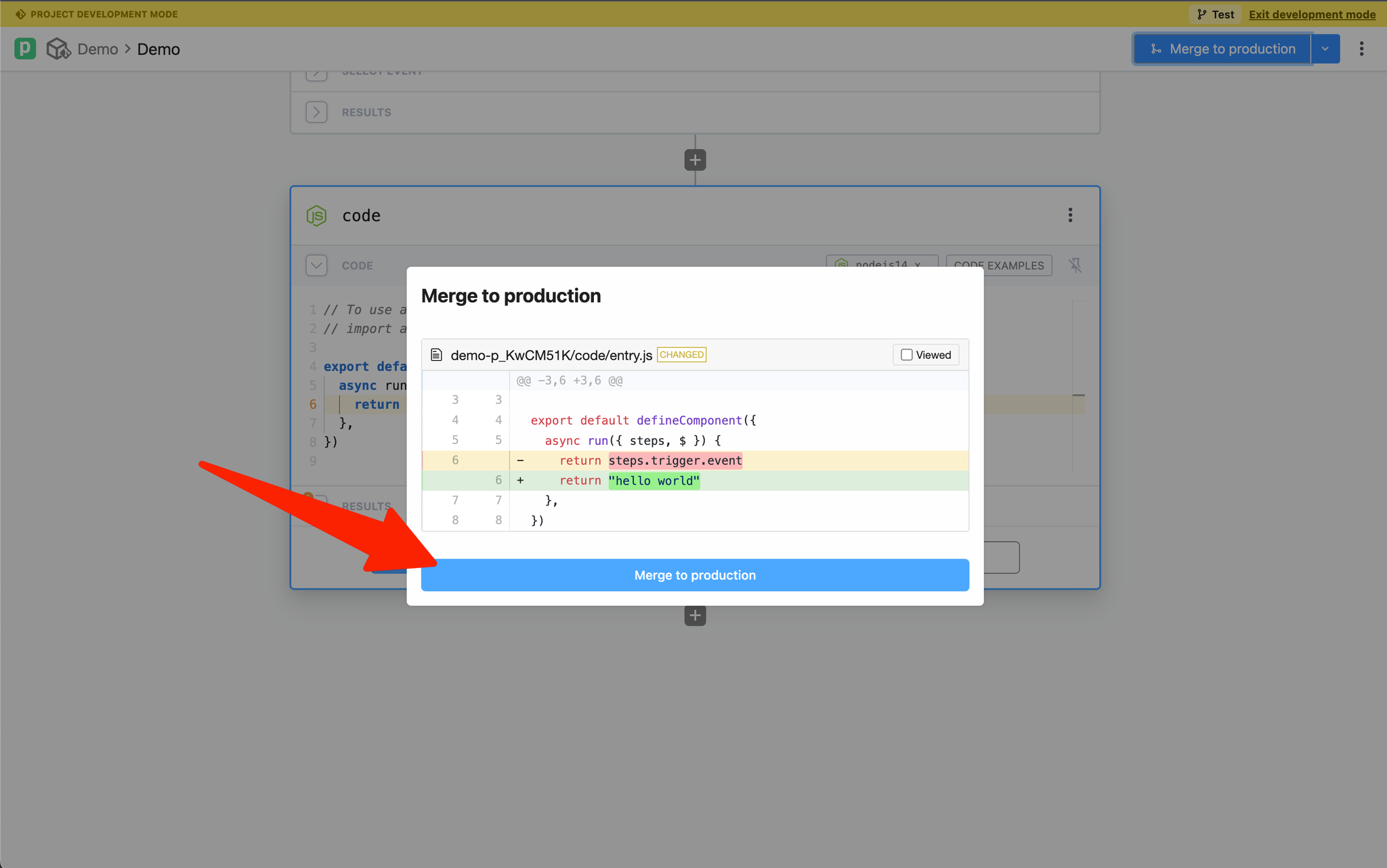 To merge changes to production, click on Merge to production: