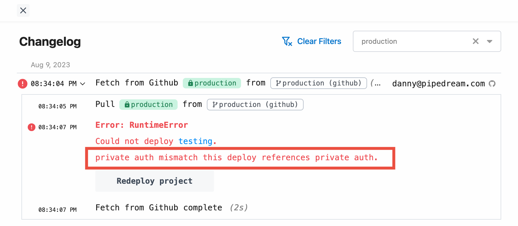 Why am I seeing an error about “private auth mismatch” when trying to merge a branch to production?