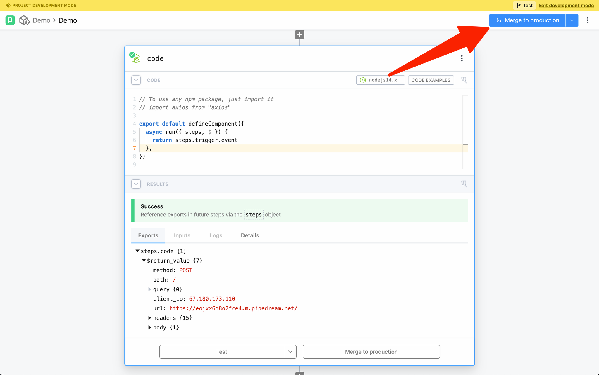 Merge via the Pipedream UI