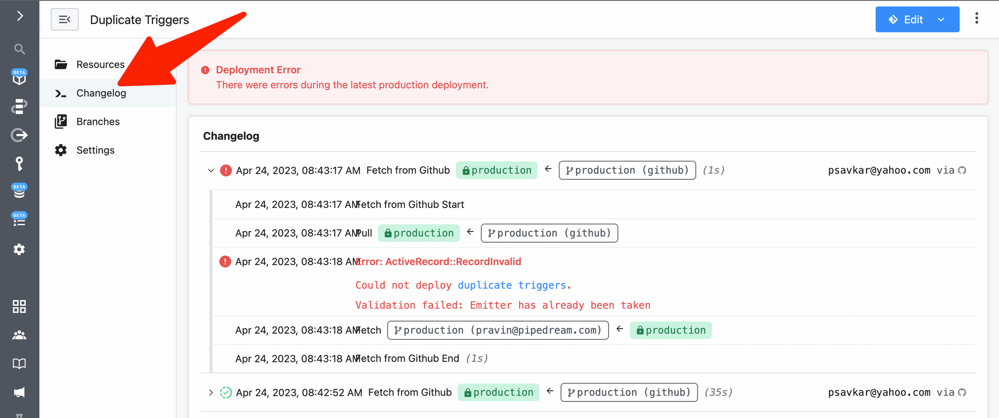 The changelog tracks all git activity (for projects with GitHub sync enabled). If you encounter an error merging your project, go to the changelog and explore the log details to help you troubleshoot issues in your workflows: