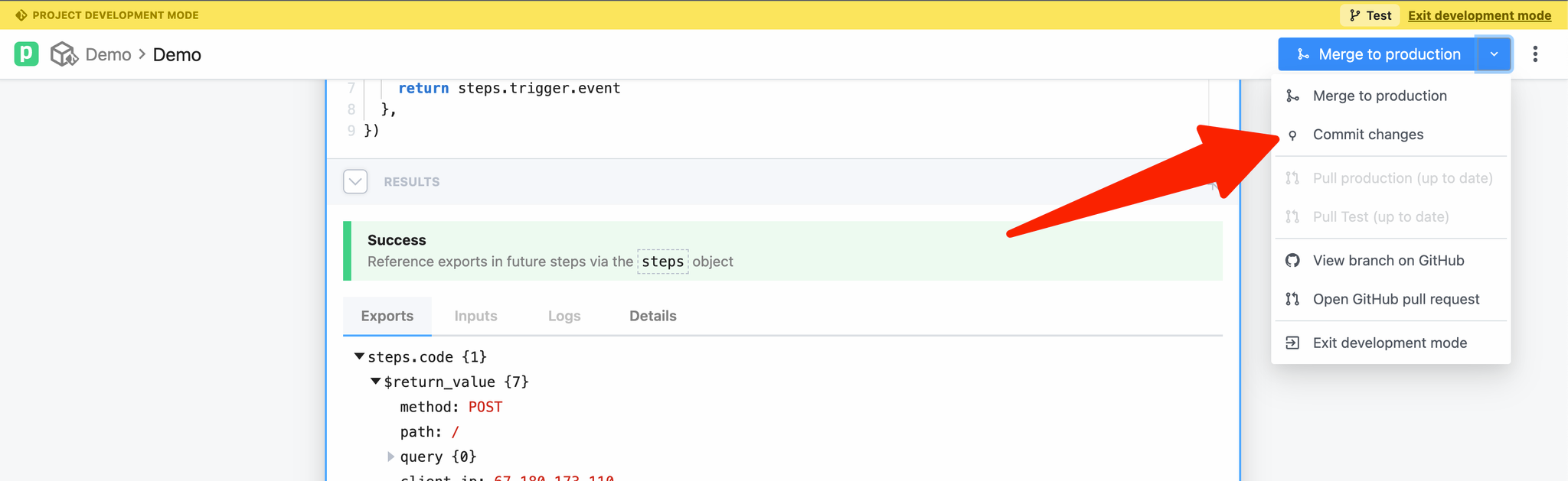 - Open your project in the Pipedream UI and select your development branch.