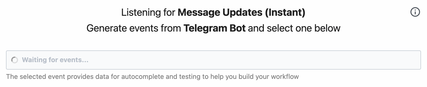 These sources will get triggered immediately. But because events come in in real-time, most will not automatically fetch historical events upon creation. To surface test events in your workflow while building, you’ll need to generate an eligible event in the selected app. For example, if you’ve configured the “Message Updates (Instant) Telegram source, you’ll need to send a message in the Telegram account you’ve selected in order for an event to appear.