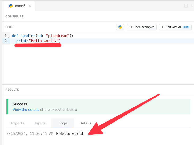 If you need to use data from other steps or export data to other steps in your workflow, we recommend using the pipedream