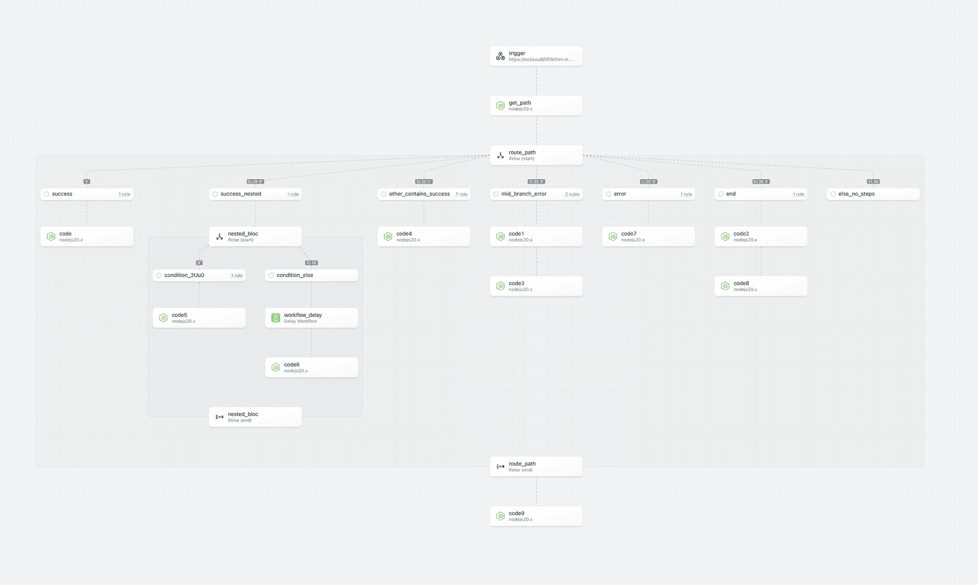step_f is executed after a control flow block. It can directly reference prior steps in the root workflow segment (trigger, step_a and step_b using the steps object).
