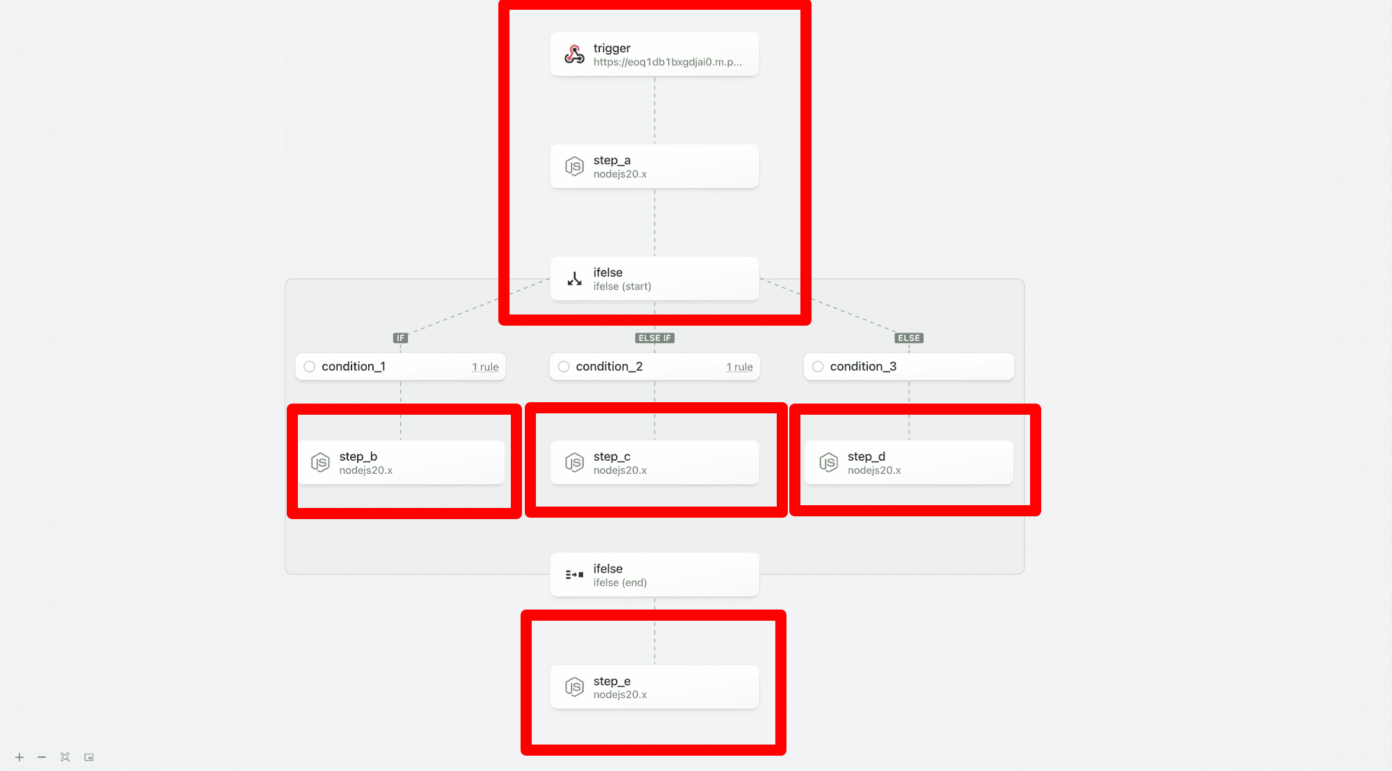 Steps may only reference prior steps in the same workflow segment or it’s direct ancestors. In the following example,step_c and step_d (within the if/else control flow block) can directly reference any exports from trigger, step_a, or step_b (in the parent/root workflow segment) via the steps object. step_c and step_d are siblings and cannot reference exports from each other.