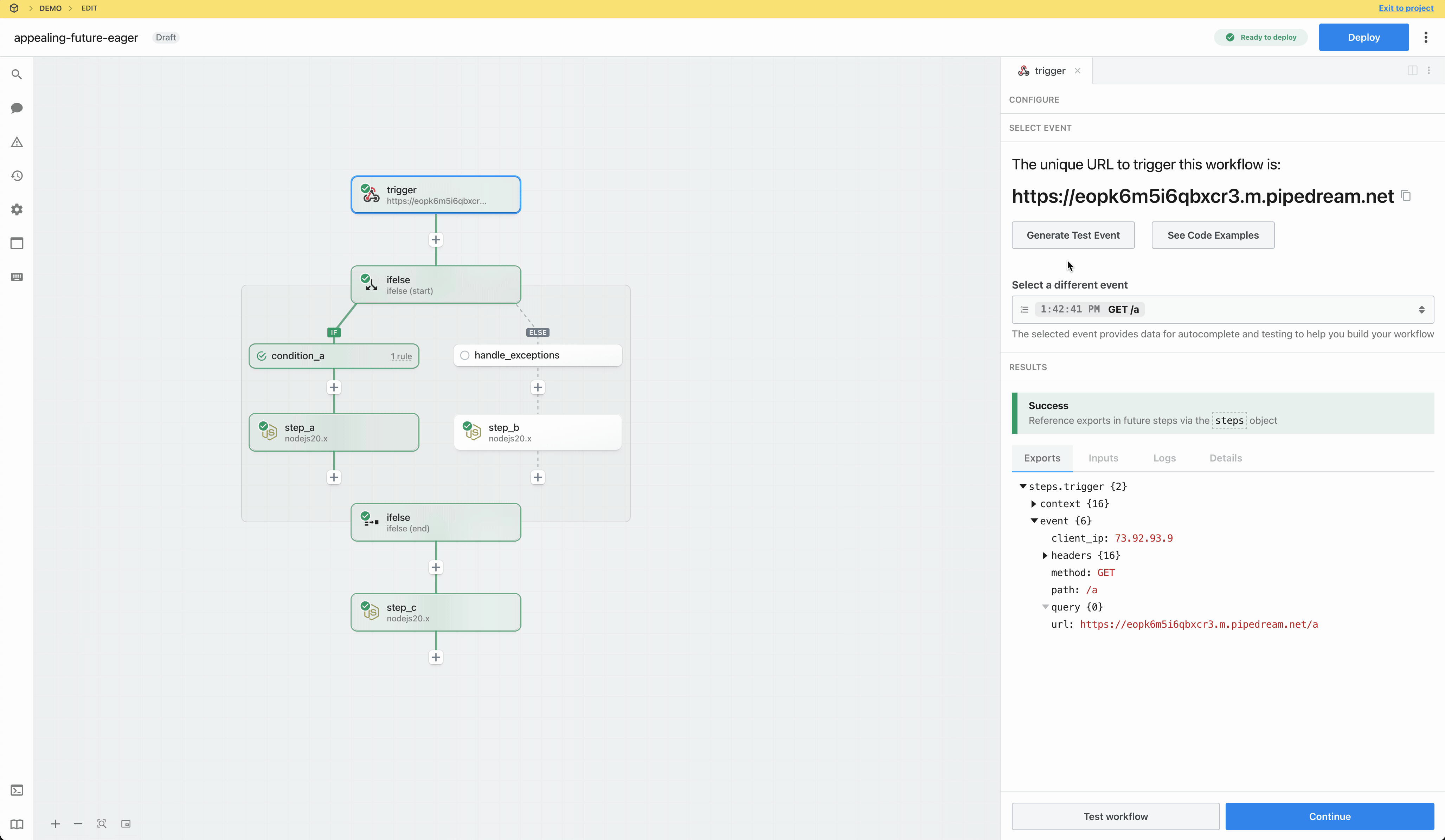 In this example, step_f can reference the exported data for an executed branch by referencing steps.ifelse.$return_value.