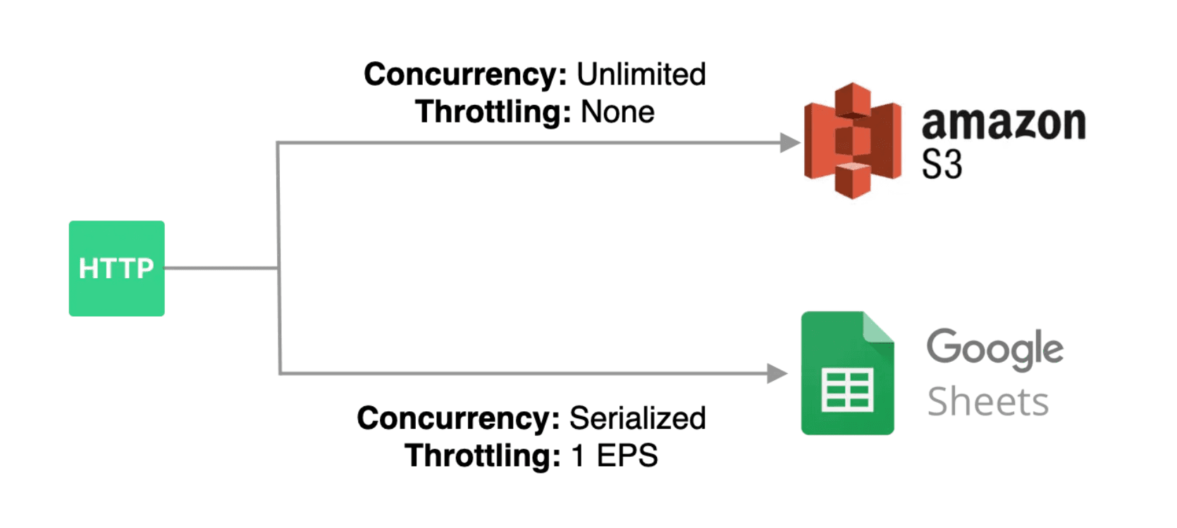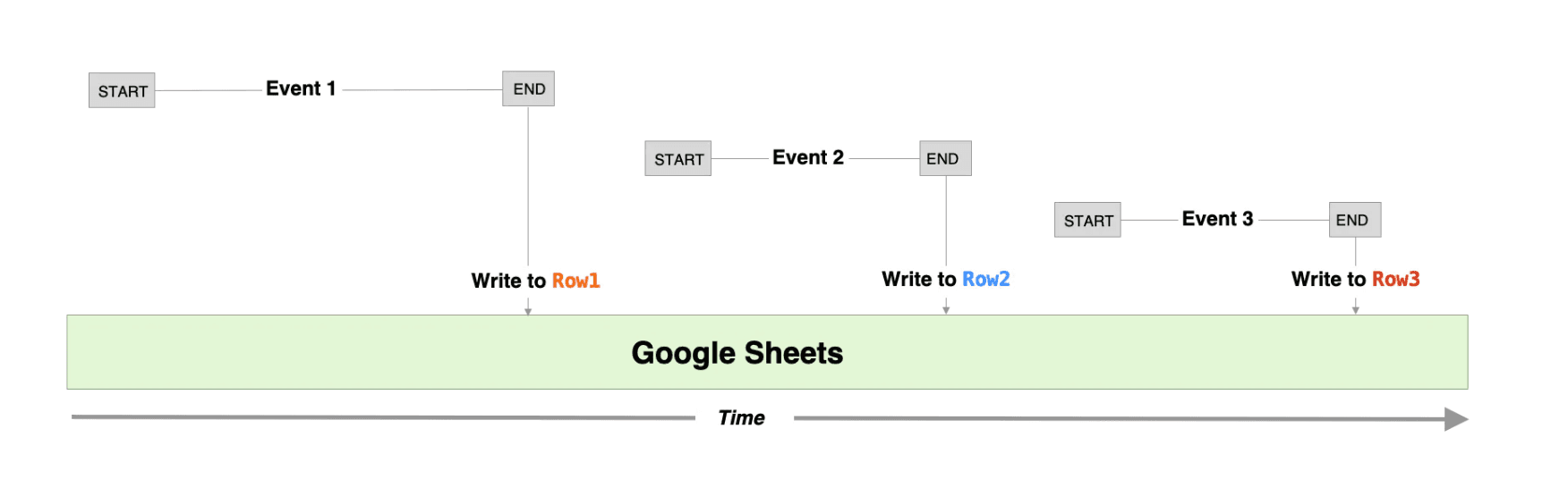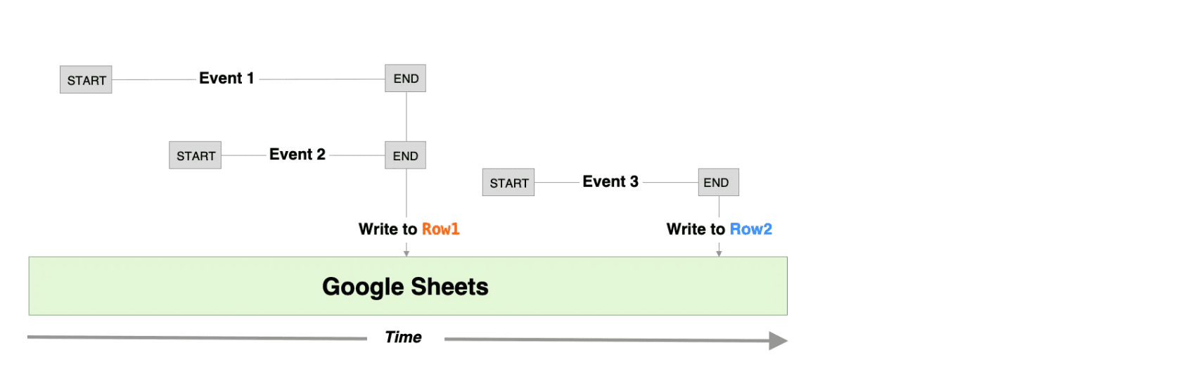 attempt to write data to Google Sheets concurrently — as a result, they will both write to the same row and the data for one event will be overwritten and lost (and no error will be thrown).