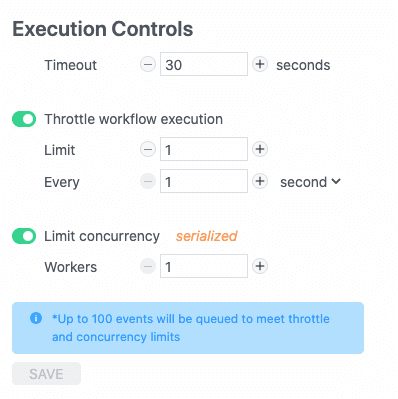 Concurrency and throttling can be managed in the Execution Controls section of your Workflow Settings. Event queues are currently supported for any workflow that is triggered by an event source. Event queues are not currently supported for native workflow triggers (native HTTP, cron, SDK and email).
