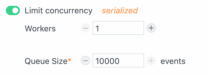 5 Workers | Off | Up to 5 events will trigger your workflow in parallel as soon as they are received. If more events arrive while 5 events are being processed, they will be queued and executed in order as soon as an event completes processing. |