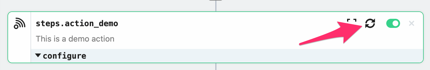 Hover over the action in your workflow —you should see an update icon at the top right. Click the icon to update the action to the latest version and then save the workflow. If you don’t see the icon, verify that the CLI successfully published the update or try refreshing the page.