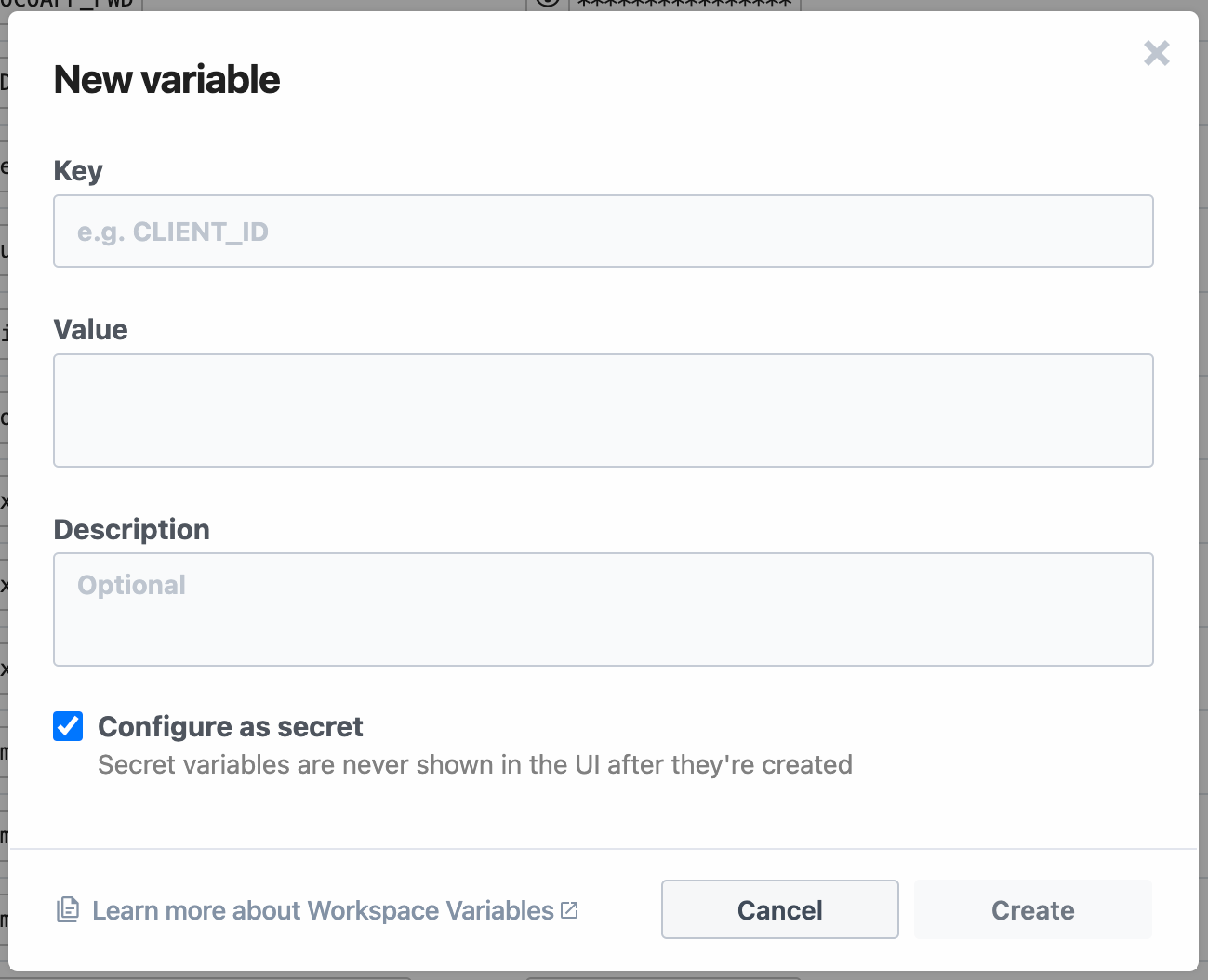 Secret | New variables default to secret. If configured as a secret, the value is never exposed in the UI and cannot be modified. |