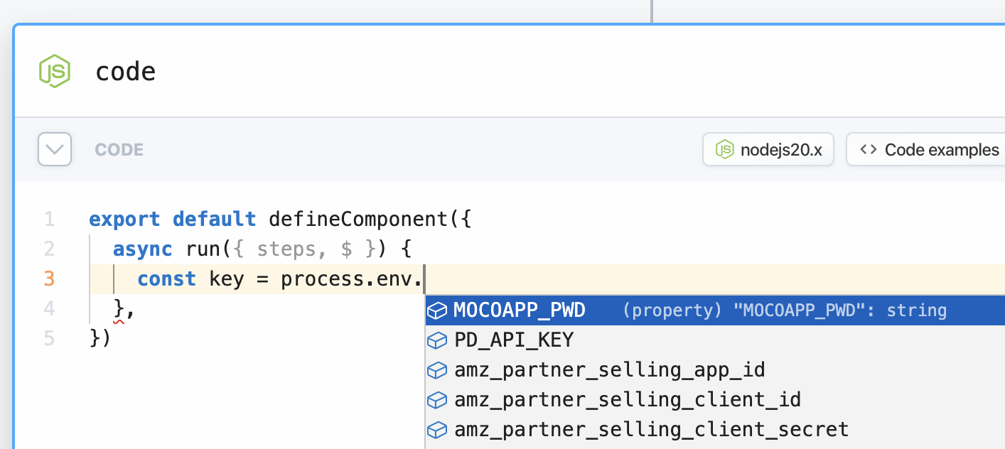 When referencing env vars directly in code within your Pipedream workflow, you can also take advantage of autocomplete: