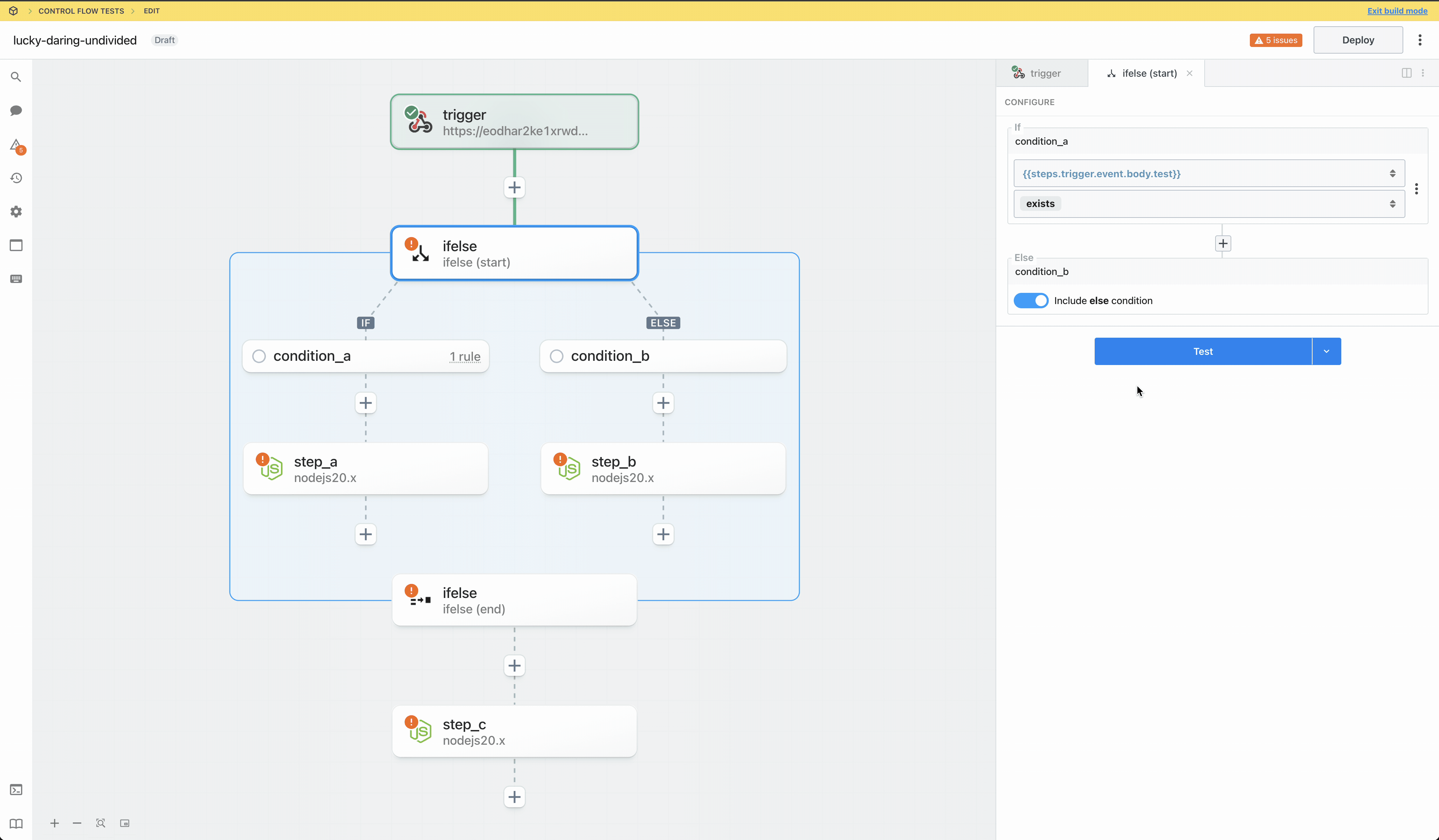When building a workflow with a control flow block, we recommend testing the start phase, followed by steps in the execution path followed by the end phase.