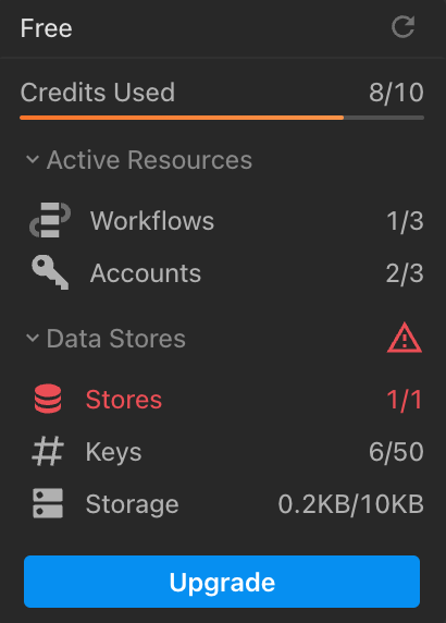 Free Pipedream account have a limit on the number of execution credits. Paid plans are not capped but are subject to additional usage charges (you can manually set a usage cap if you want to manage costs).You can view your credits usage at the bottom-left of the Pipedream UI. You can also see more detailed usage in Billing and Usage Settings. Here you’ll find your usage for the last 30 days, broken out by day, by resource (e.g. your source / workflow).