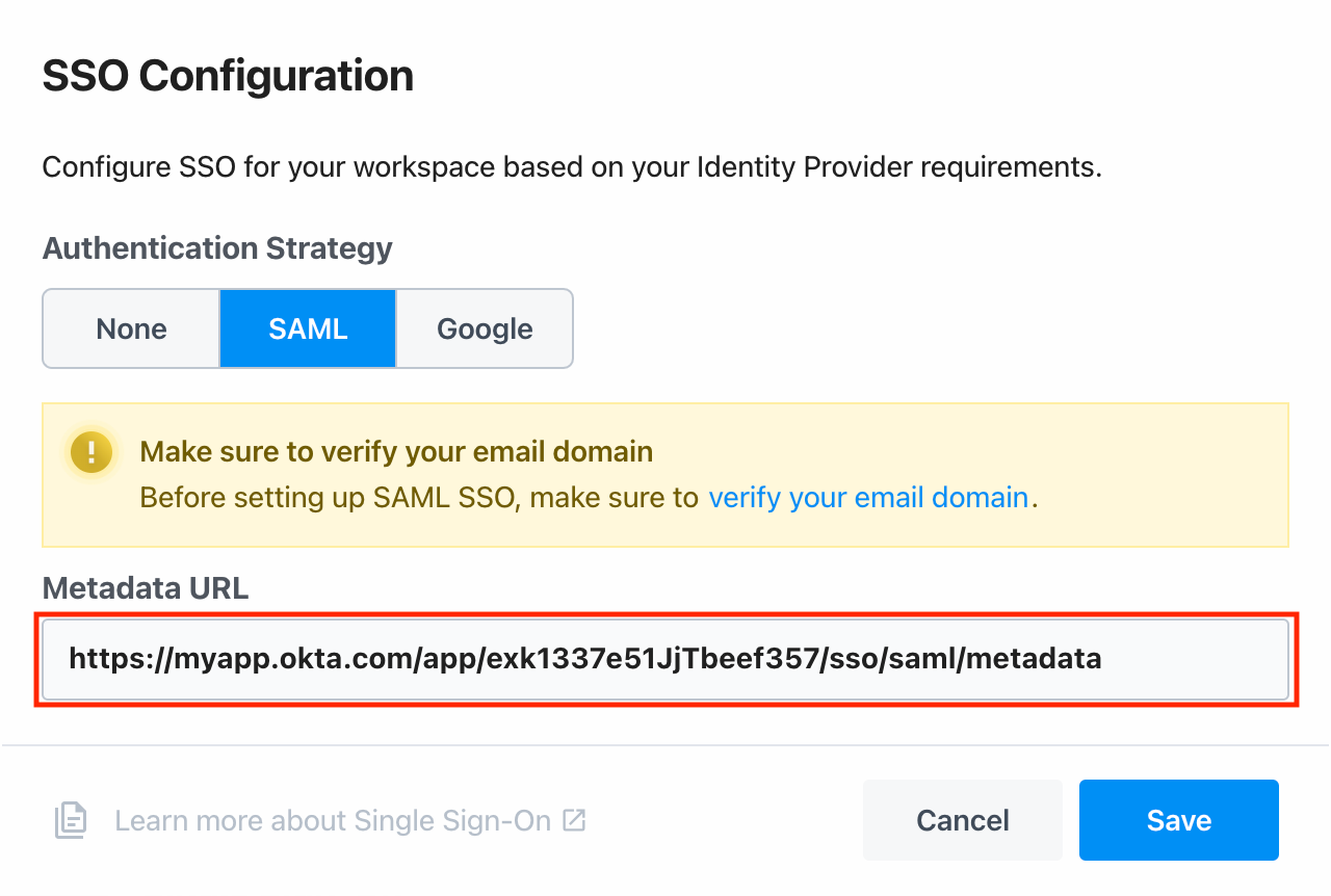 Visit your Pipedream workspace authentication settings. Click the toggle to Enable SSO, then click Edit SSO Configuration, and add the metadata URL in the SAML section and click Save: