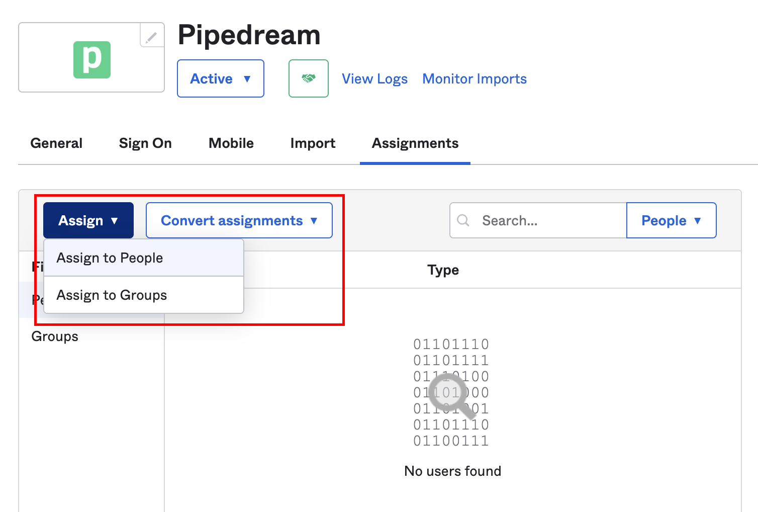 Back in Okta, click on the Assignments tab of the Pipedream application. Click on the Assign dropdown and select Assign to People: